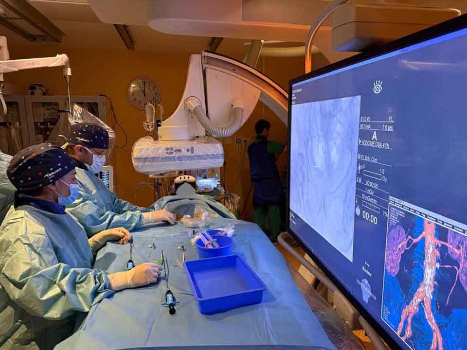 In accordo con i professionisti della Radiologia interventistica e dell’Anestesia e rianimazione dell’Ospedale Santa Rosa di Viterbo si è deciso di impiegare questa metodica ad un paziente anziano con diverse patologie e ricoverato per un aneurisma dell’aorta addominale pararenale.